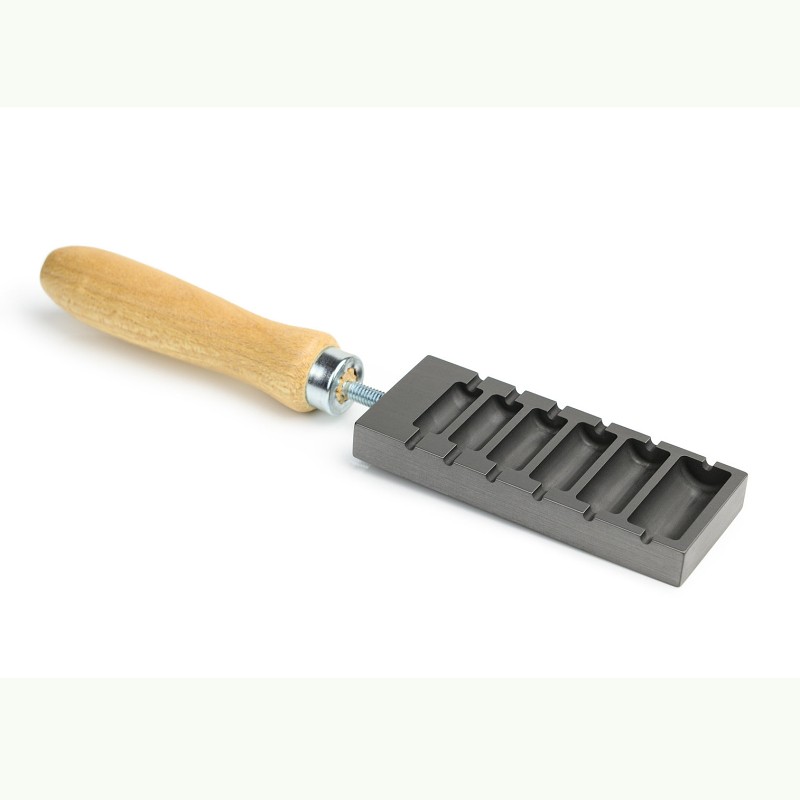 | Size: | This knife is ideal for all flat surfaces (e.g. rollers, cones, bicones, pastilles) up to 30 mm in length. Material: brass, handle: beech wood. (1 last piece only) |