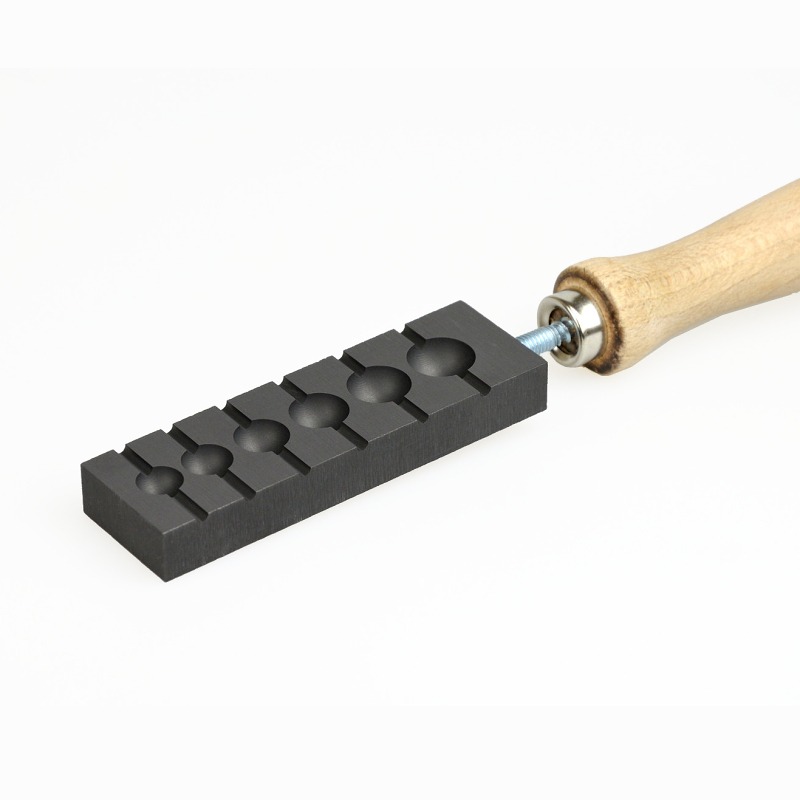 | Size: | Lampwork tool bead roller 6 spheres, small: 10, 11, 12, 13, 14 and 15 mm. 3 mm mandrel guide for mandrels up to 2.4 mm. Material bead roller: graphite, handle: beech wood. (1 last piece only) |